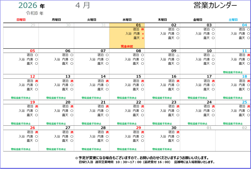 4/1(水)のみ、完全休館といたします。