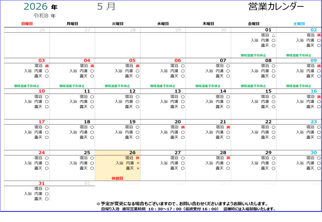 宿泊、日帰り入浴すべて休館 : 5/26(火)
